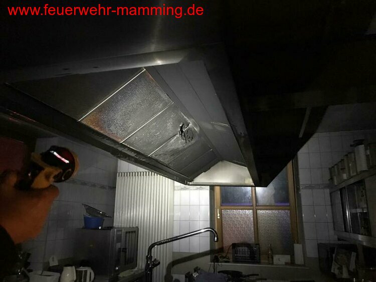 Lokalisierung der Brandursache unter Atemschutz, Fettbrand mit Ausbreitung über den Kamin. Die weitere Kontrolle mittels Wärmebildkamera im Innen und Außenbereich ergab, dass sich das Feuer nicht weiter als über den Kamin ausgebreitet hatte und inzwischen erloschen war. Überdruckbelüftung zur Entrauchung des Gebäudes und erneute, abschließende Kontrolle mittels WBK.
