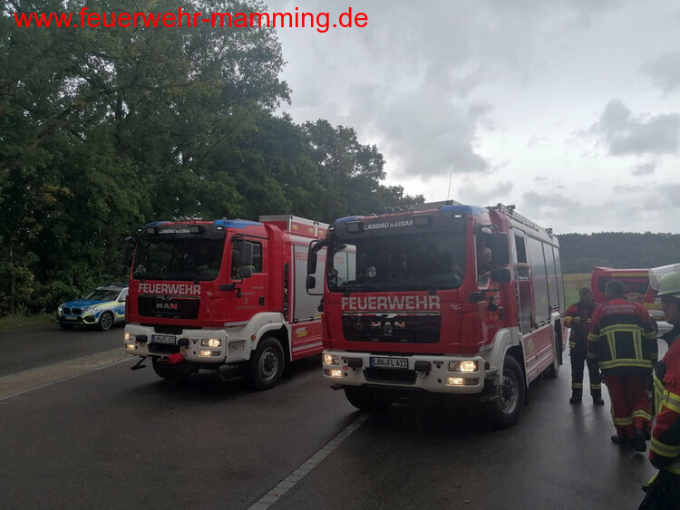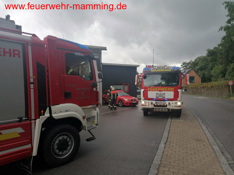 Erkundungsfahrt durch die beiden Fahrzeuge 40/1 und 14/1. Sammelpunkt für alle anrückenden Wehren am Feuerwehrhaus Mamming zur Besprechung der weiteren Maßnahmen.