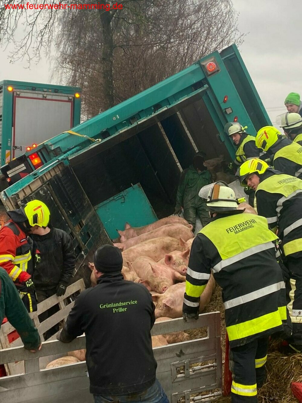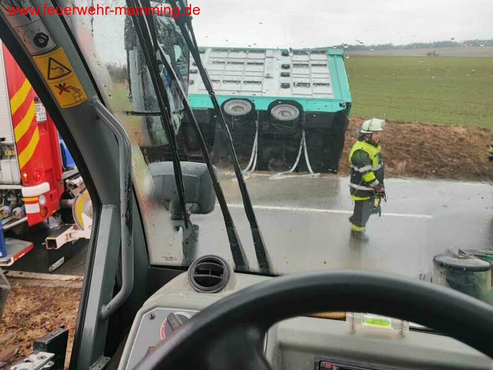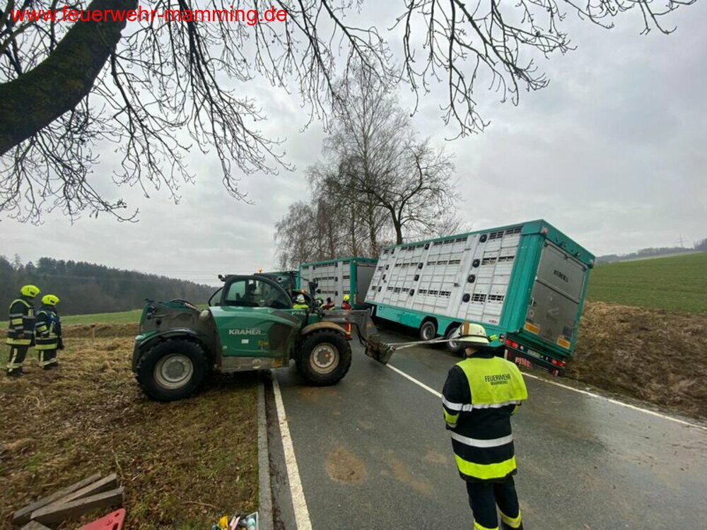 Alarmierung zu einem verunfallten LKW. Die darin transportierten Tiere konnten alle wohlbehalten umgeladen werden und der LKW wurde anschließend gemeinsam mit anliegenden Landwirten geborgen.