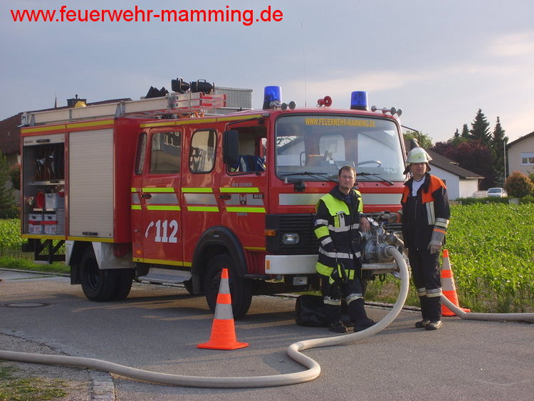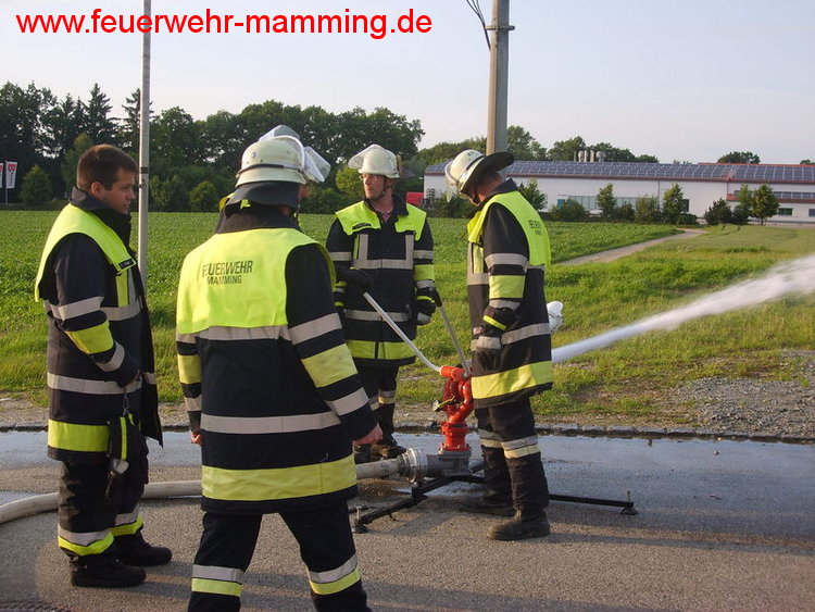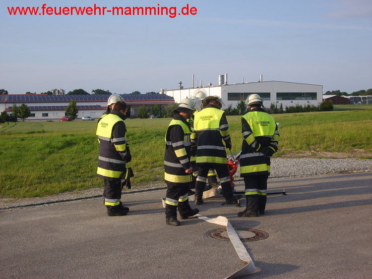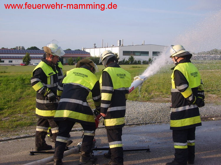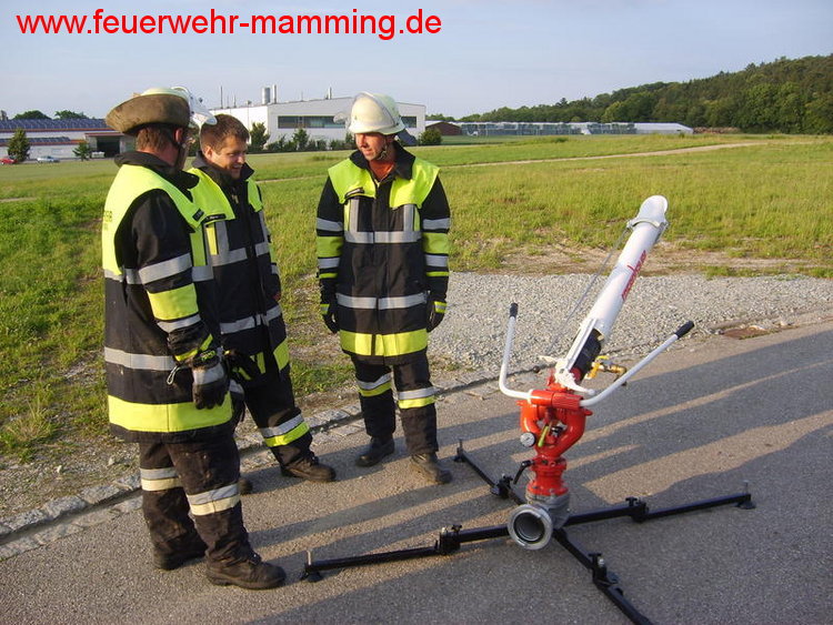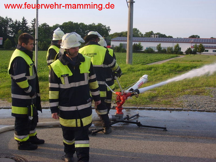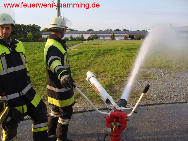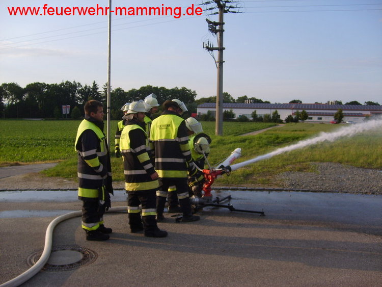 Einsatz des Wasserwerfers am Boden, Speisung durch LF8/8. Fahrertraining der Maschinisten mit beiden Fahrzeugen. Ortskunde: Rettungsmöglichkeiten und Zufahrtswege Sportplatz
