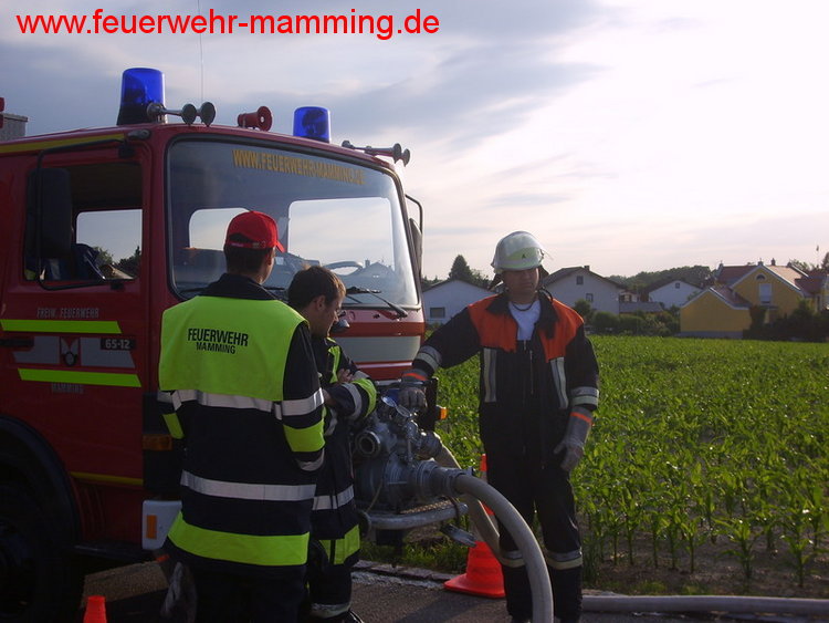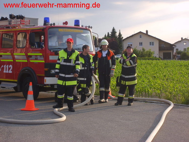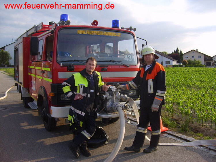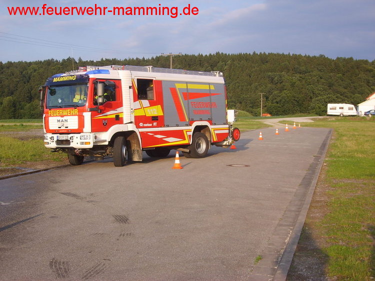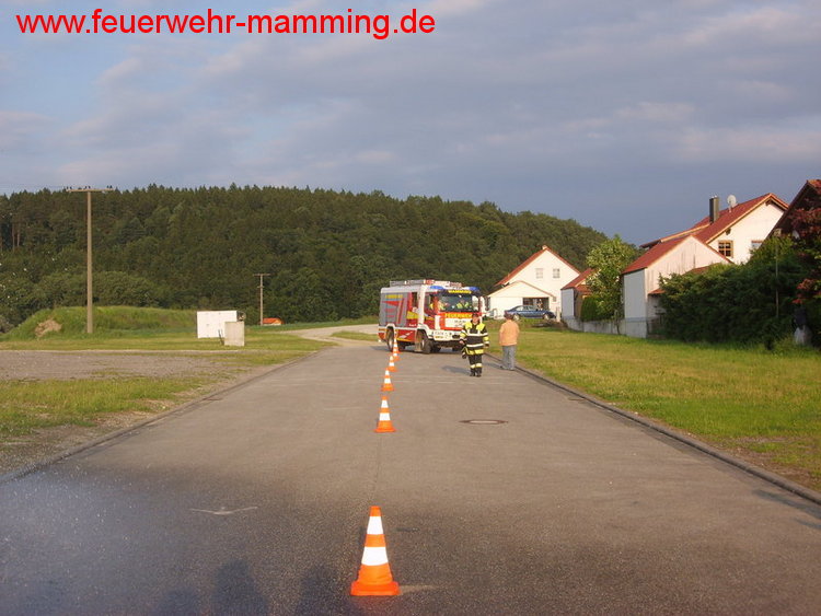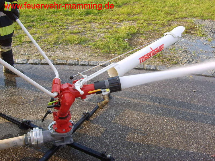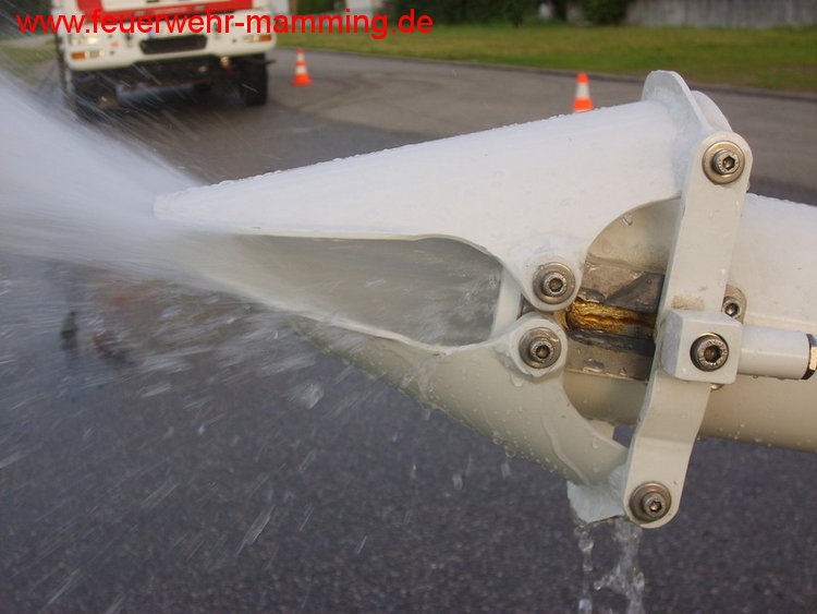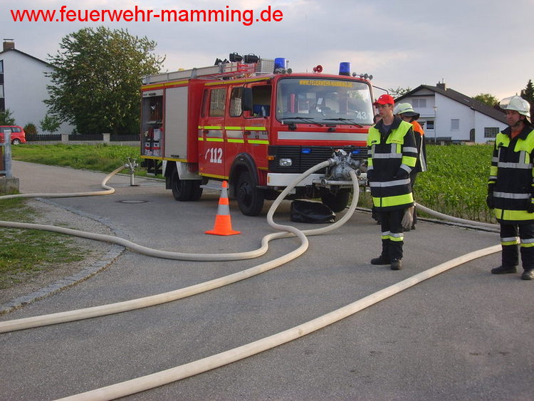 Einsatz des Wasserwerfers am Boden, Speisung durch LF8/8. Fahrertraining der Maschinisten mit beiden Fahrzeugen. Ortskunde: Rettungsmöglichkeiten und Zufahrtswege Sportplatz