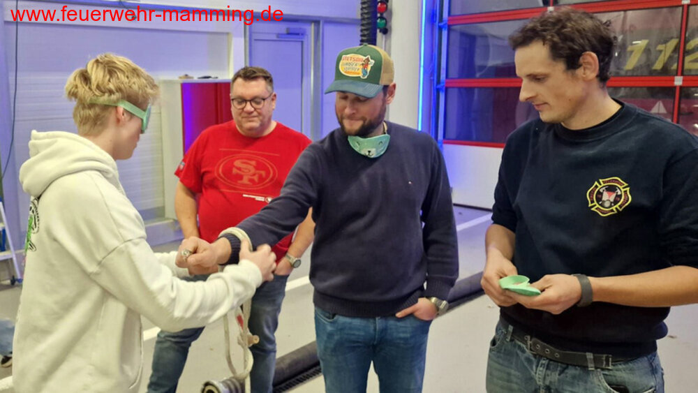 | Details: | Das Motto der diesjährigen Abschluss-Übung war "sich blind gegenseitig vertrauen". An mehreren Stationen durften die Teams mit verbundenen Augen Knoten üben, Saugschlauch kuppeln, Gegenstände erraten und Verlastungsort benennen. Abschließend folgte noch eine Runde "Personen Bingo", bei denen die Feuerwehrmänner und -frauen nur anhand von Charaktermerkmalen erraten werden mussten. Die super leckere Bewirtung übernahmen Tobi mit Hans: Schaschliktopf mit Reis und Pommes. Während des Essens erschien noch der Nikolaus, der mit lobenden - aber auch mahnenden Worten das Jahr ausklingen lies. |