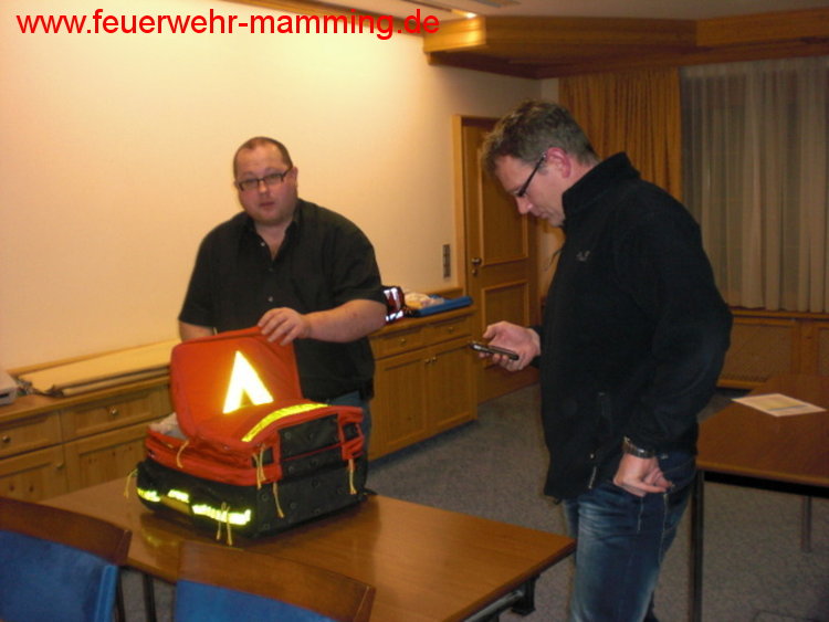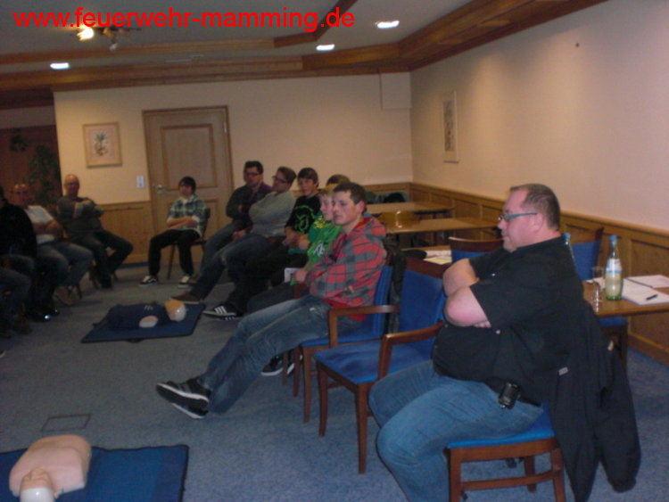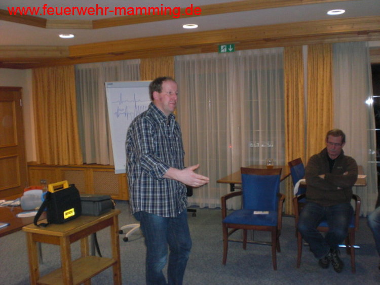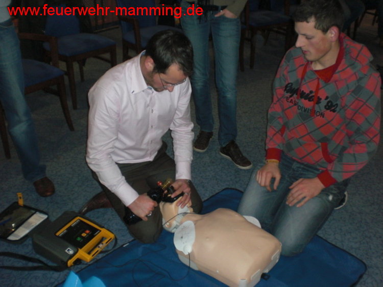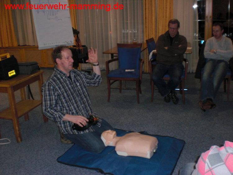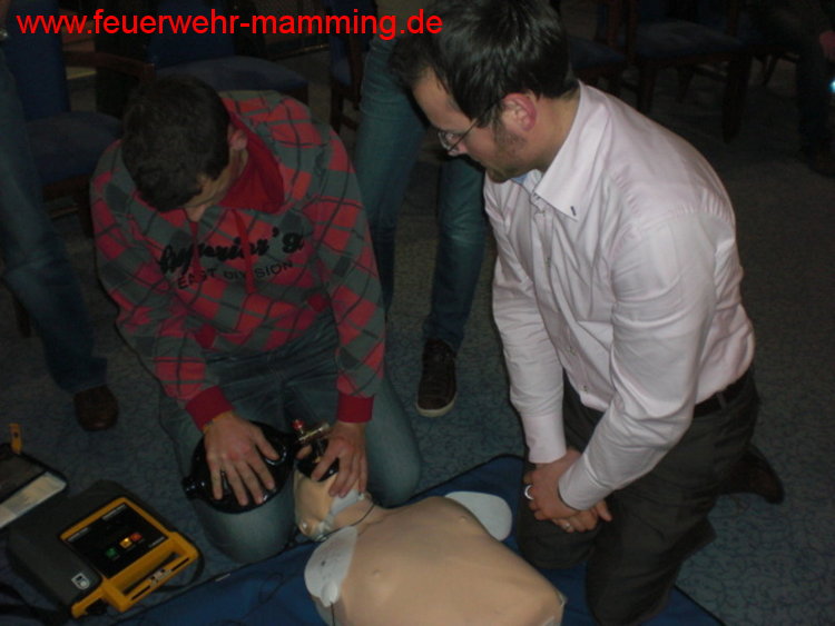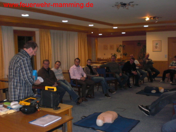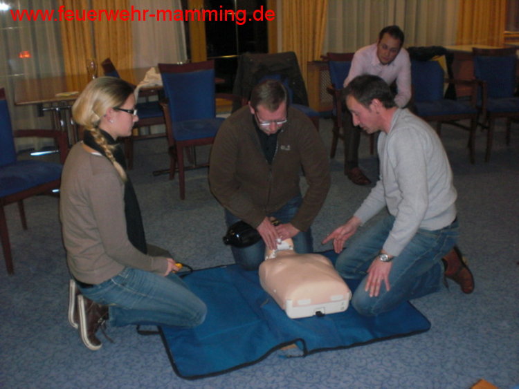 | Details: | Einladung an alle aktiven, passiven und fördernden Mitglieder der Feuerwehr Mamming zur jährlichen Auffrischung der 1. Hilfe Maßnahmen durch unser aktives Mitglied Robert Knott. Ebenso sind auch die Jugendgruppe und die Mitglieder des Mamminger Feuerwehrseniorenstammtisches recht herzlich eingeladen. Zur Auffrischung kommen Wiederbelebungsmaßnahmen, der Einsatz eines AED/Defi, das Stillen von Blutungen, usw. Die Teilnahme ist kostenlos. Wer verhindert ist oder die Schulung nochmals machen möchte, hat am 23. Februar 2012 wieder die Gelegenheit dazu. |